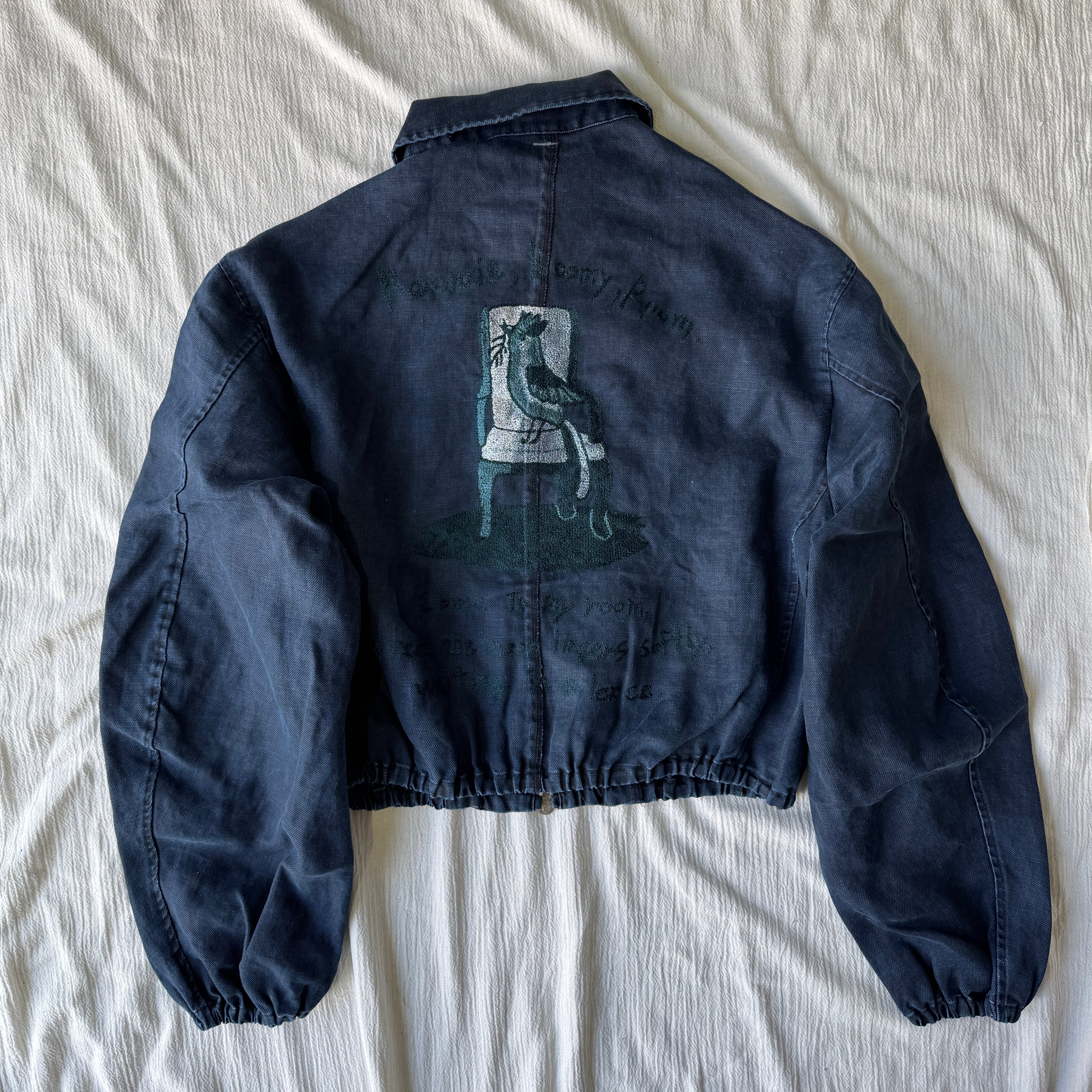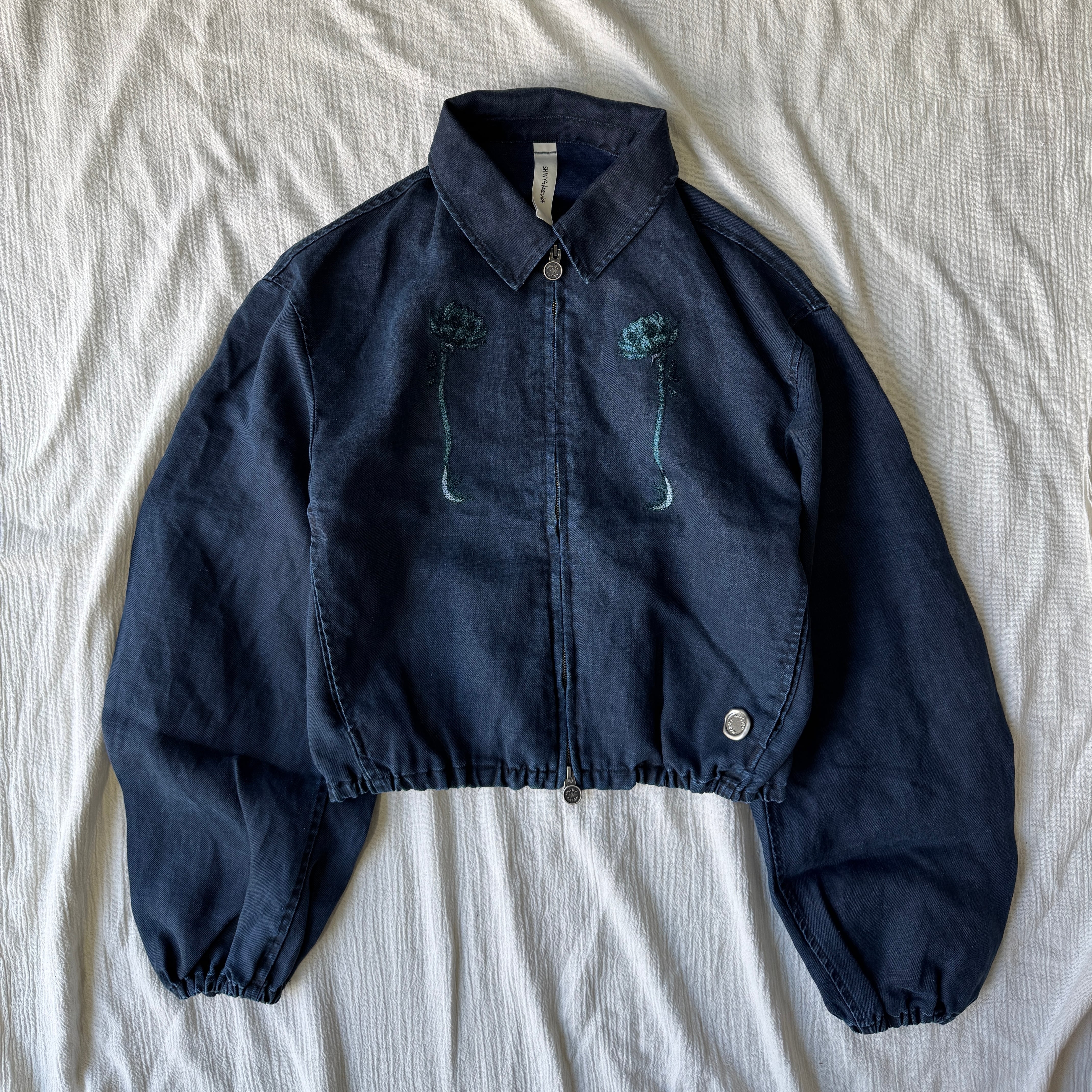 割烹着の袖をイメージして袖にボリュームを持たせたフロントジップジャケット。