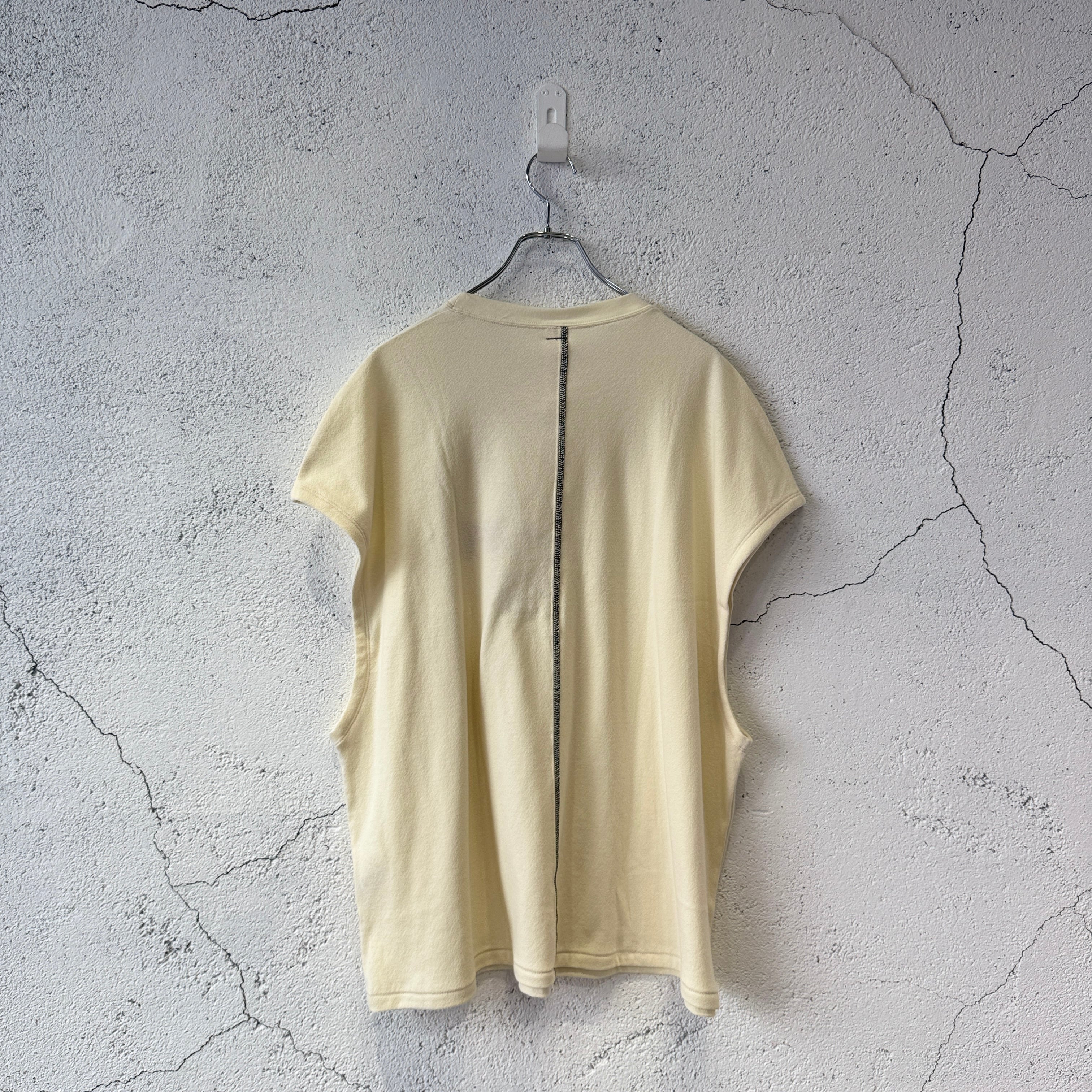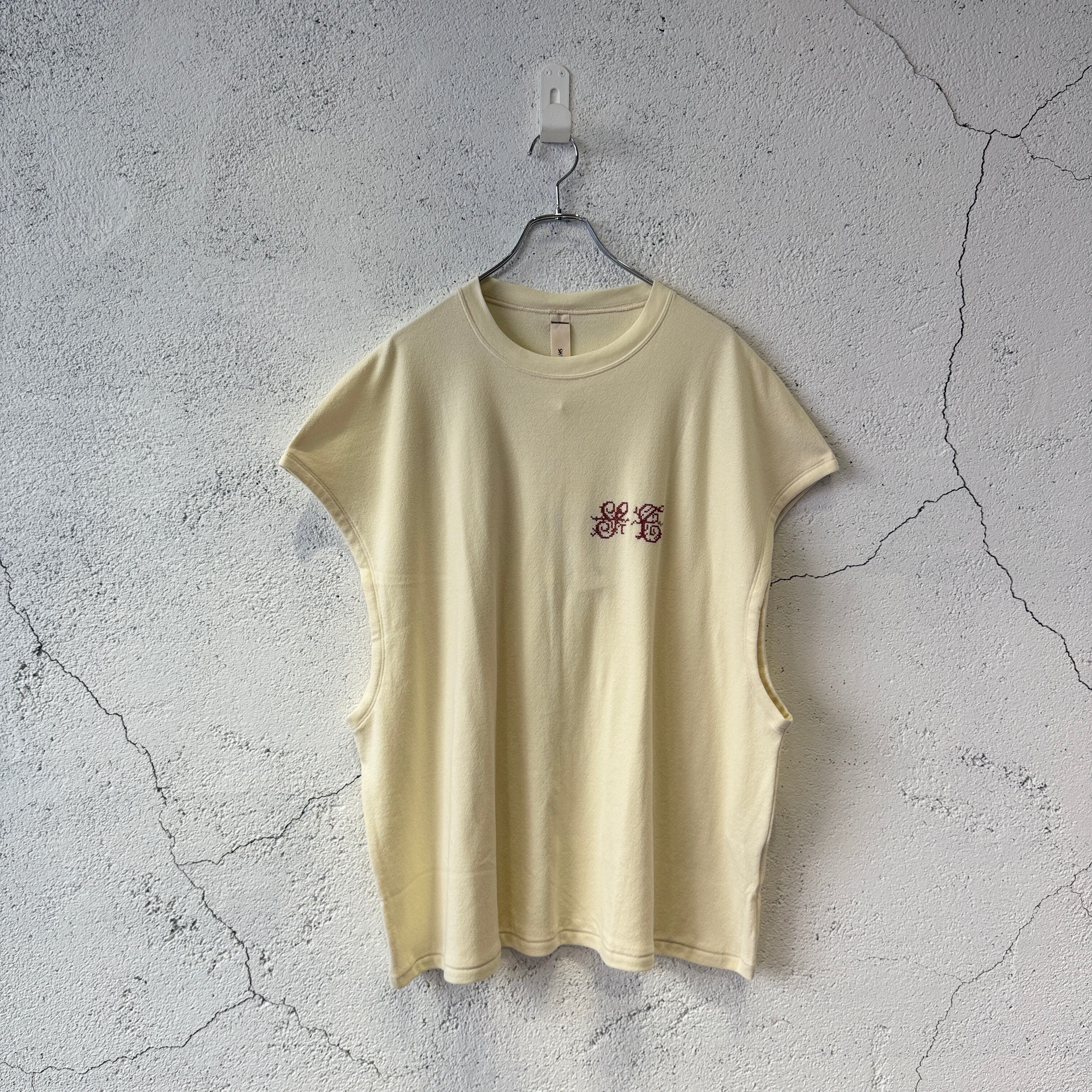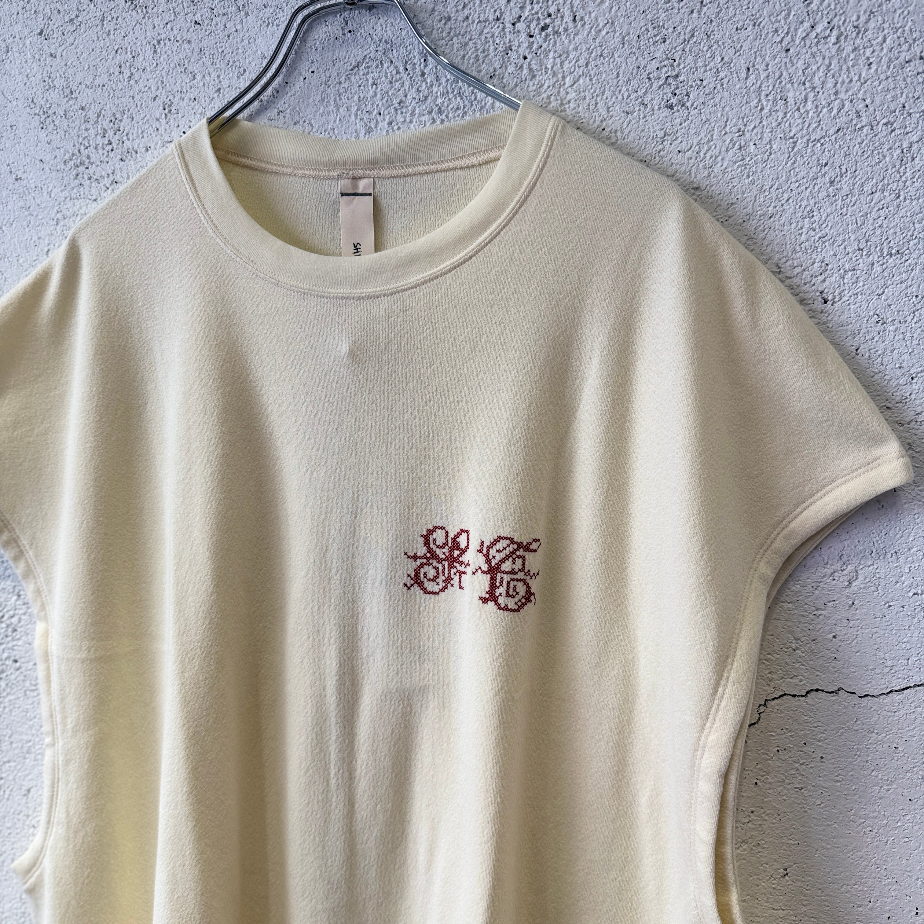 胸元にアンティーク調の刺繍を施したオーバーサイズのノースリーブTシャツ