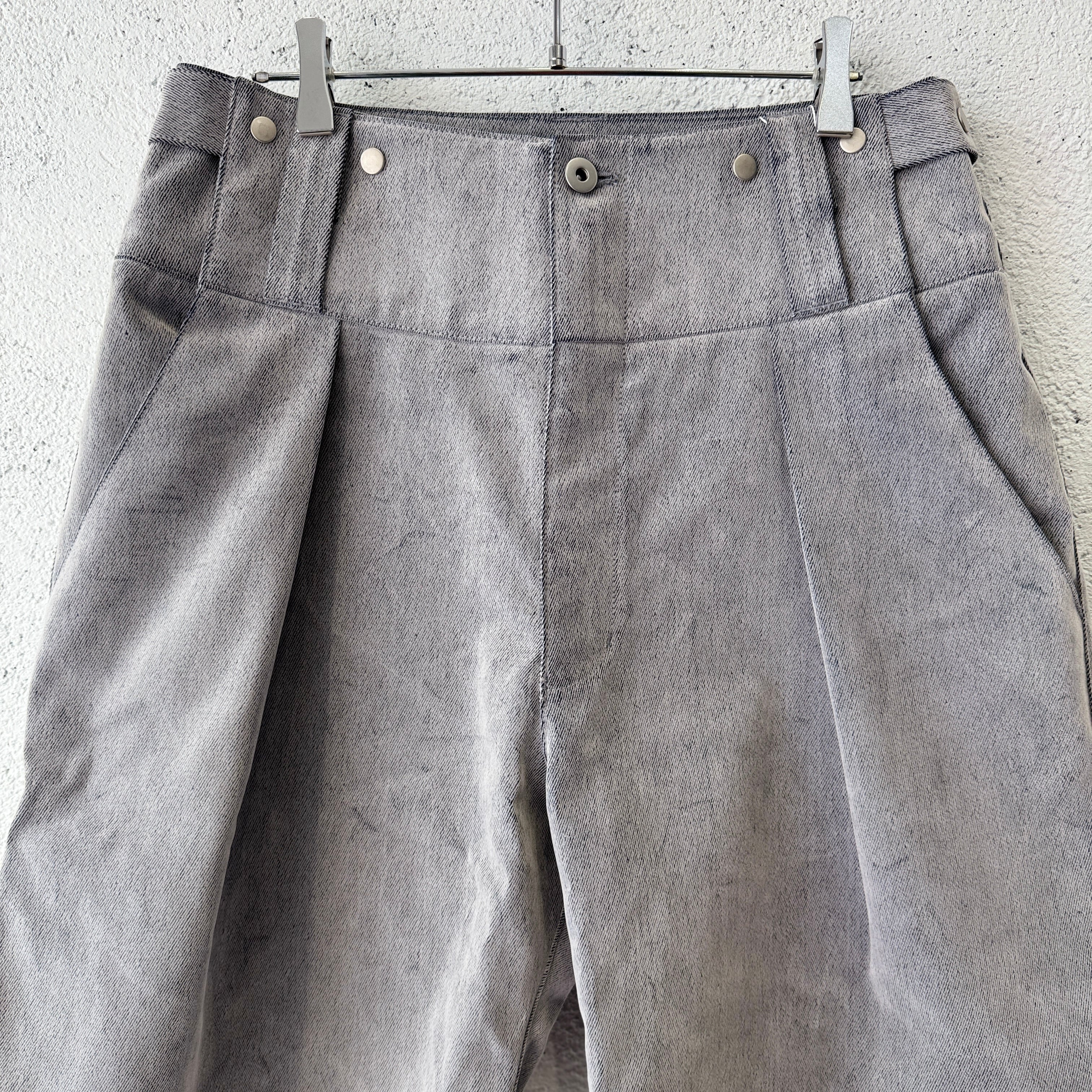 ウエストバンドを大きく配置したセーラーマリンパンツとミリタリーのアジャスターを融合したような設計が特徴のワイドタックショーツ。