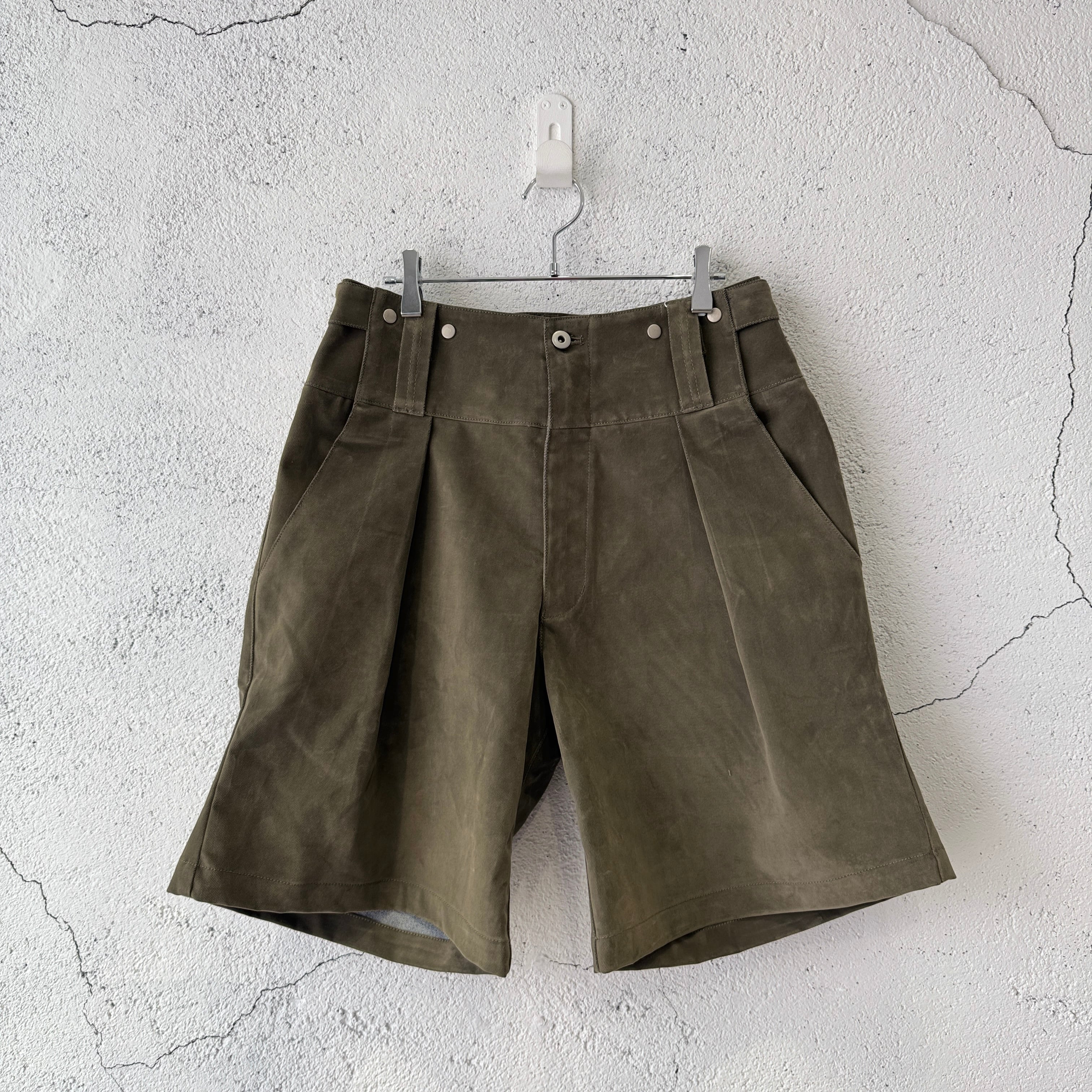 ウエストバンドを大きく配置したセーラーマリンパンツとミリタリーのアジャスターを融合したような設計が特徴のワイドタックショーツ。
