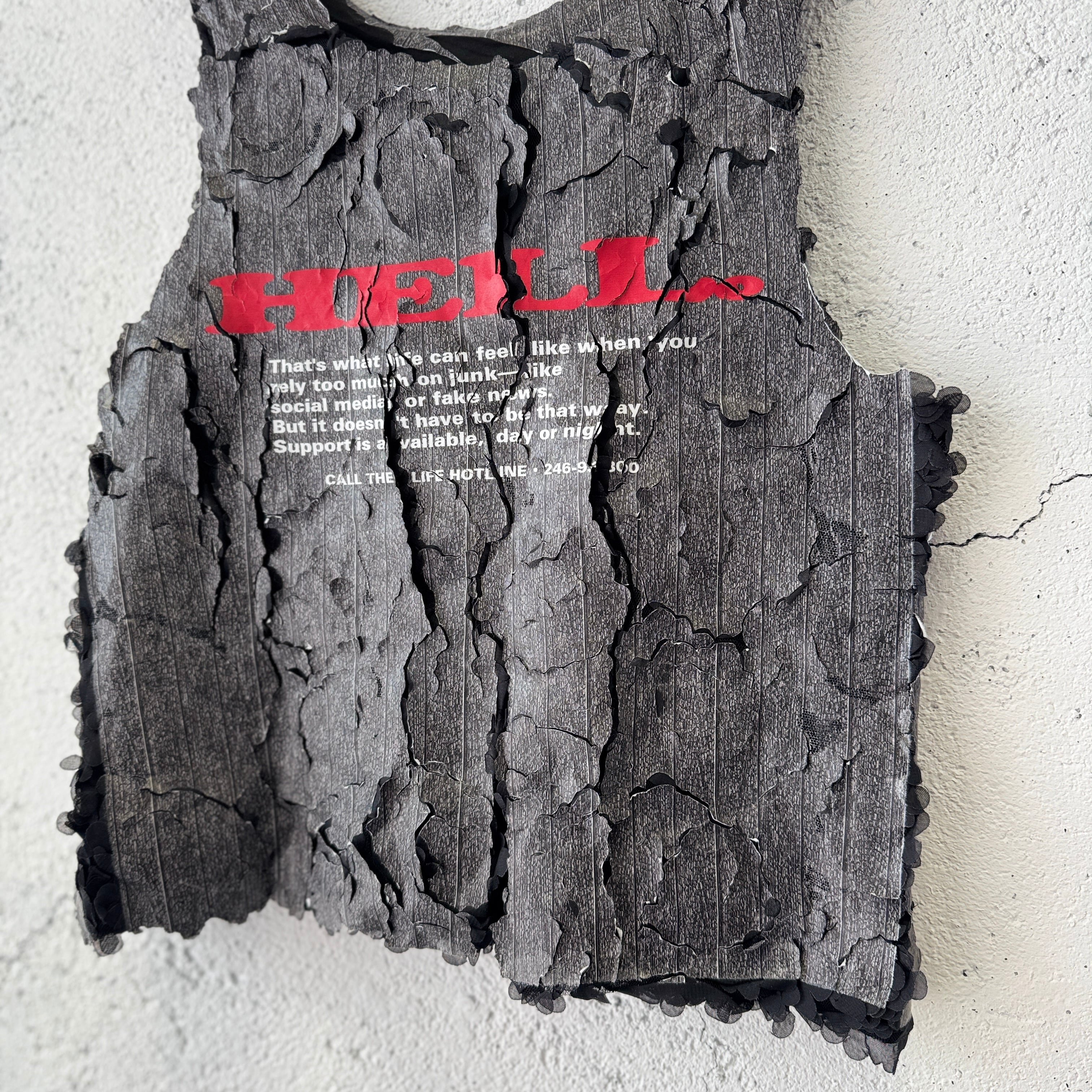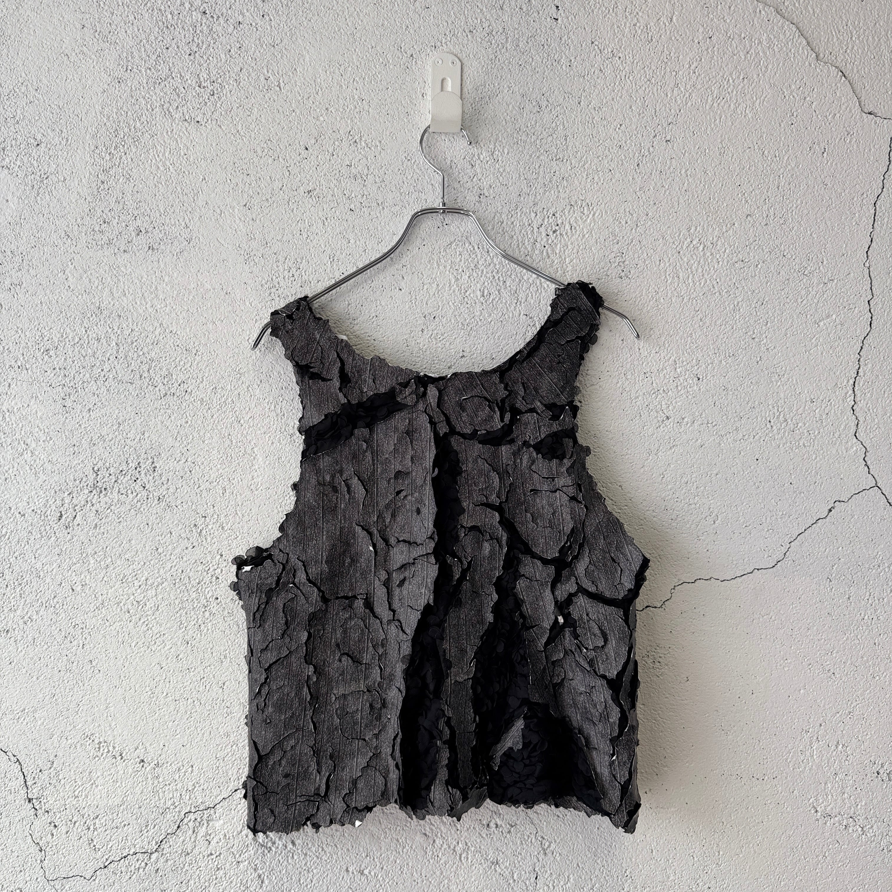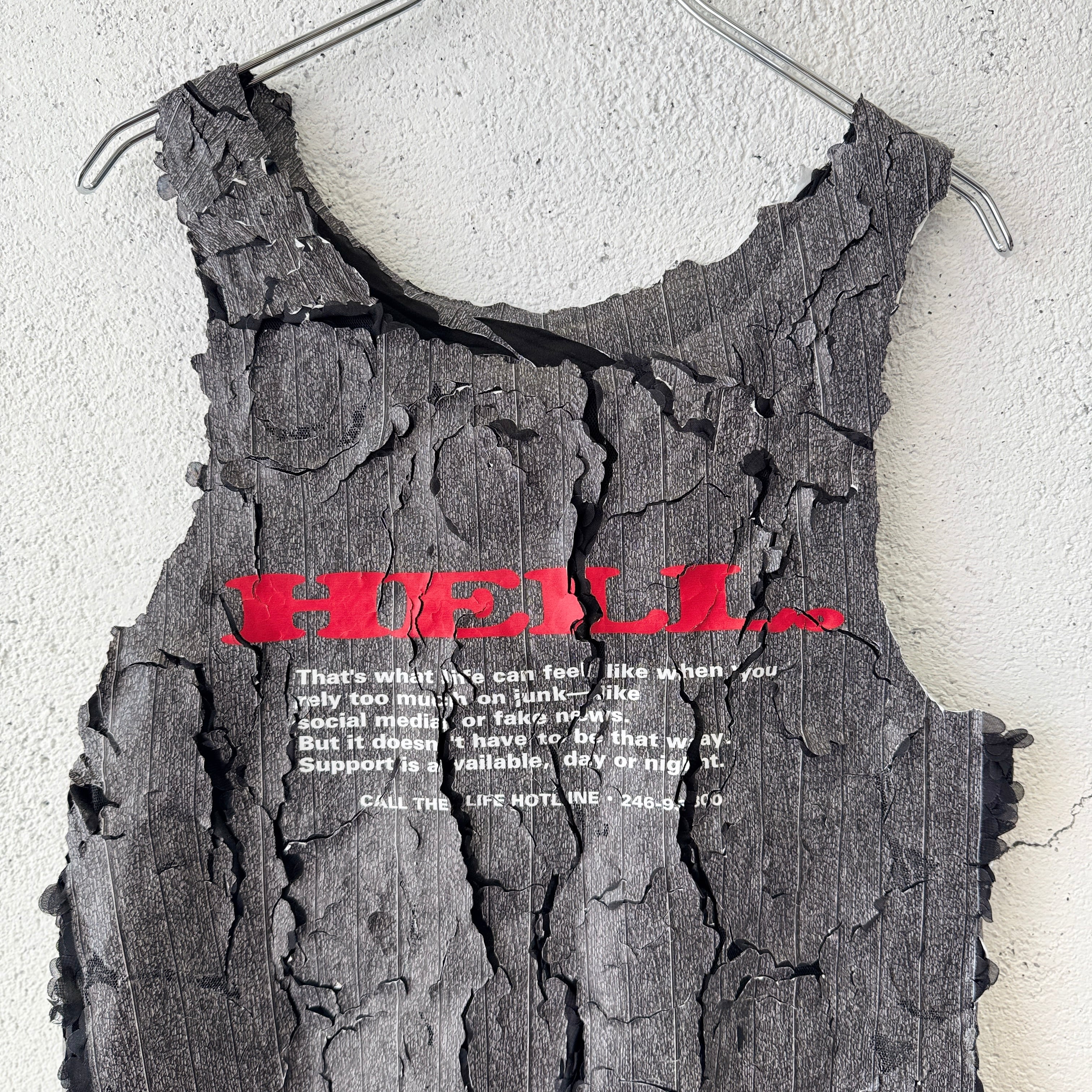 花柄のフリルを叩きつけた生地に、映画『ジェイコブス・ラダー』に登場するポスターをモチーフにしたグラフィックのラバーシートで全面プリントを施したタンクトップ