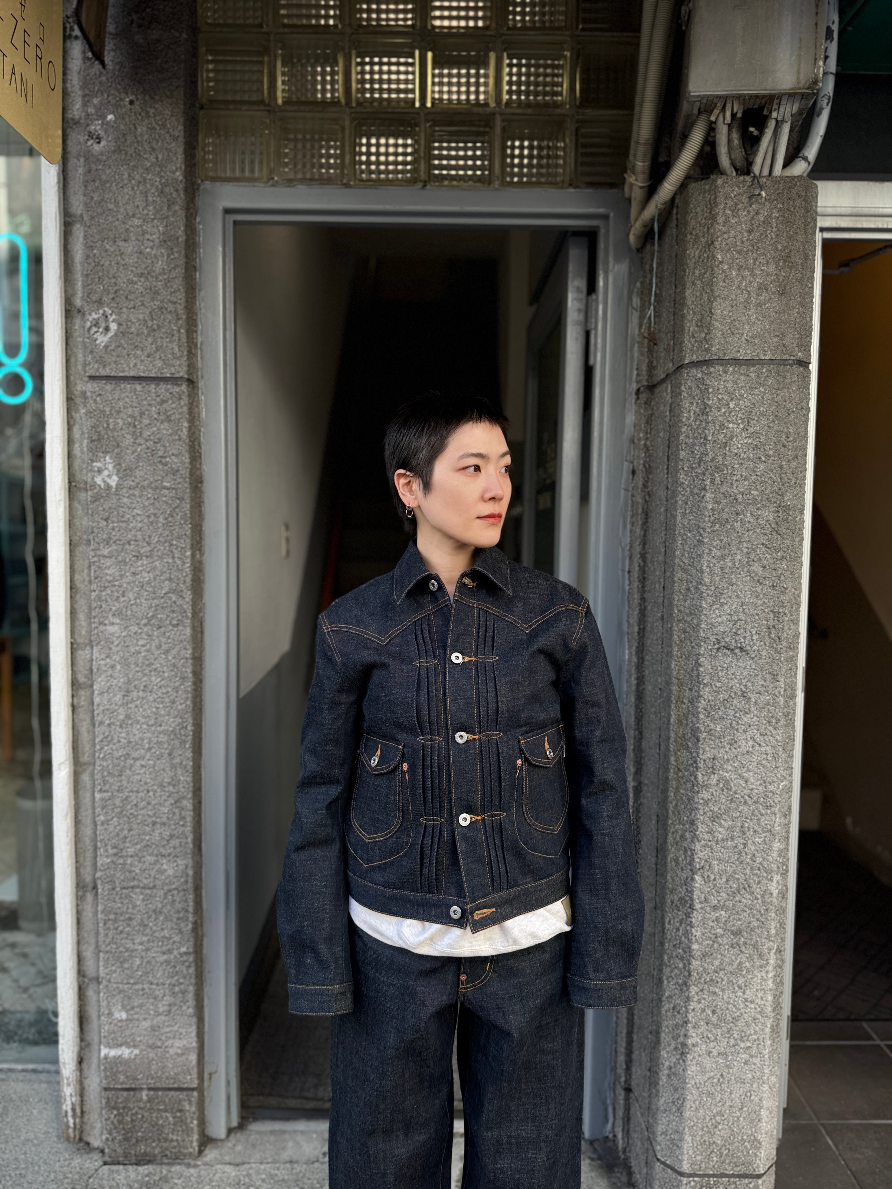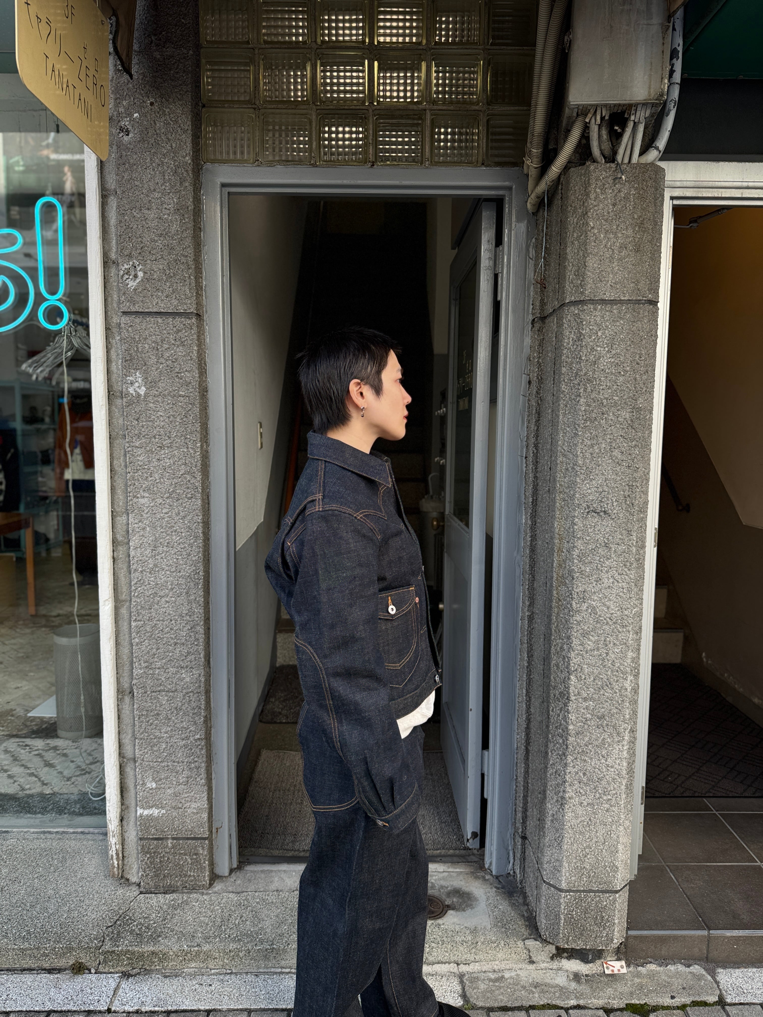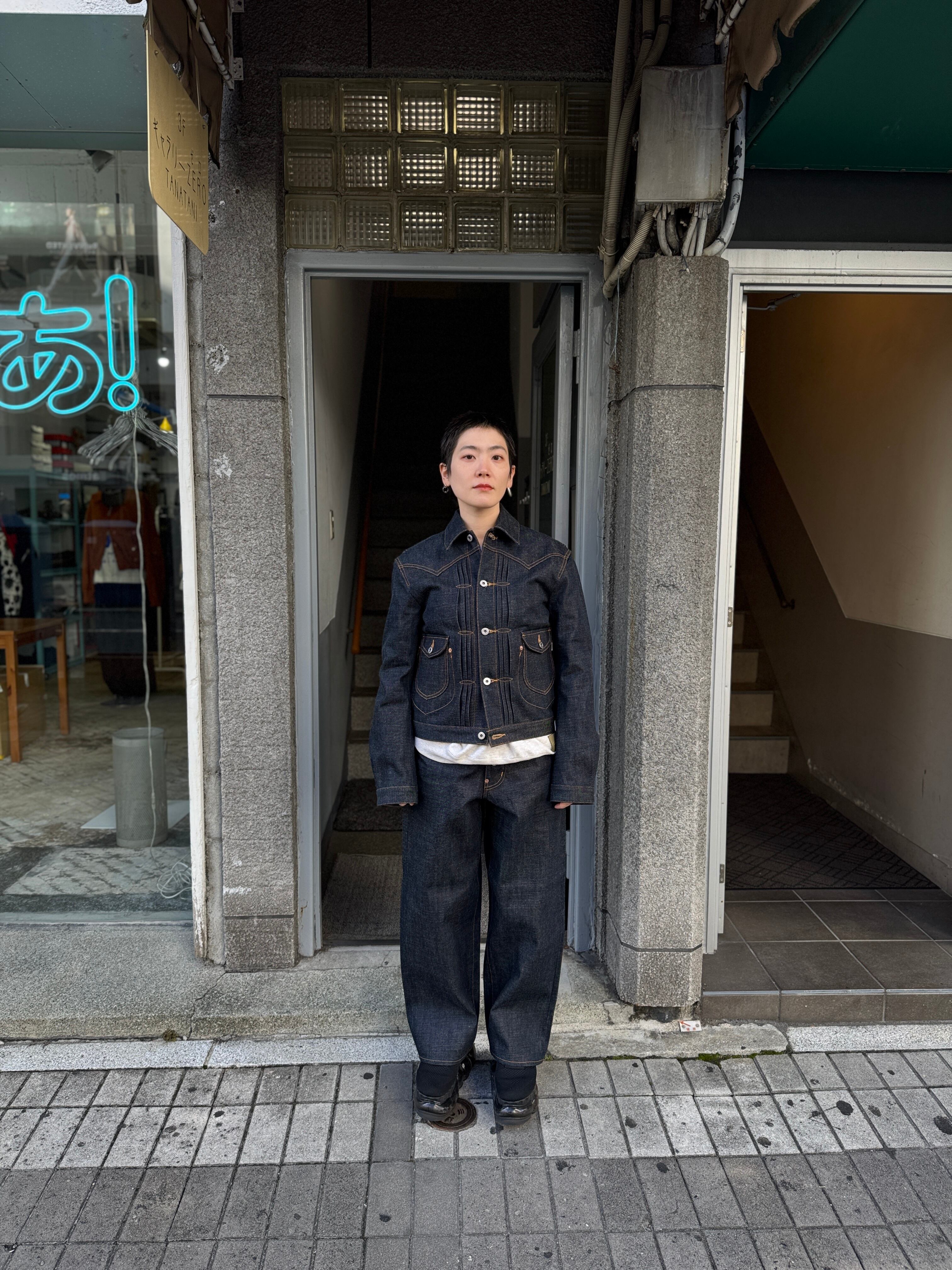 太目のシルエットが特徴的な定番のクラシックデニムパンツとのセットアップで着用したときのシルエットのコントラストが絶妙です。