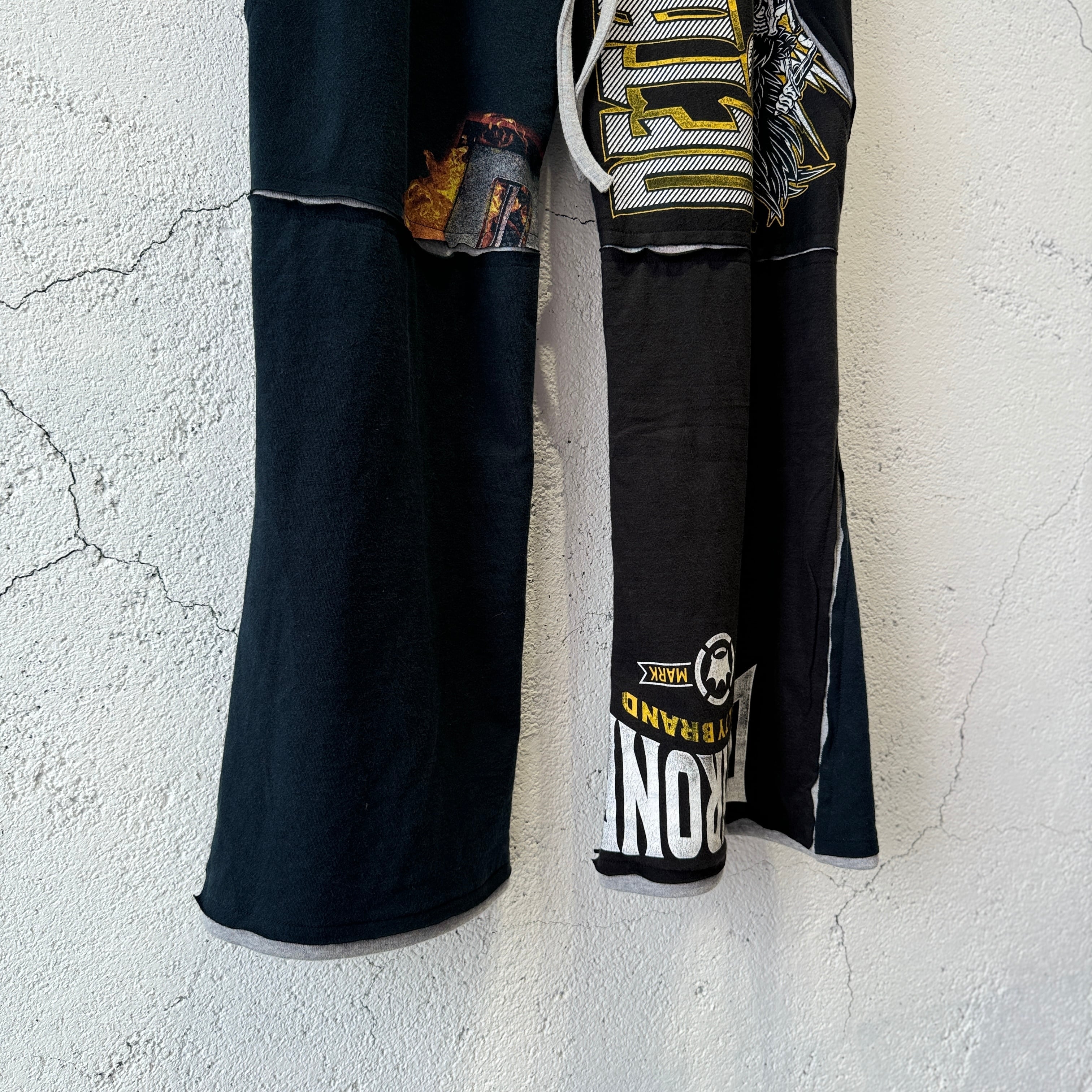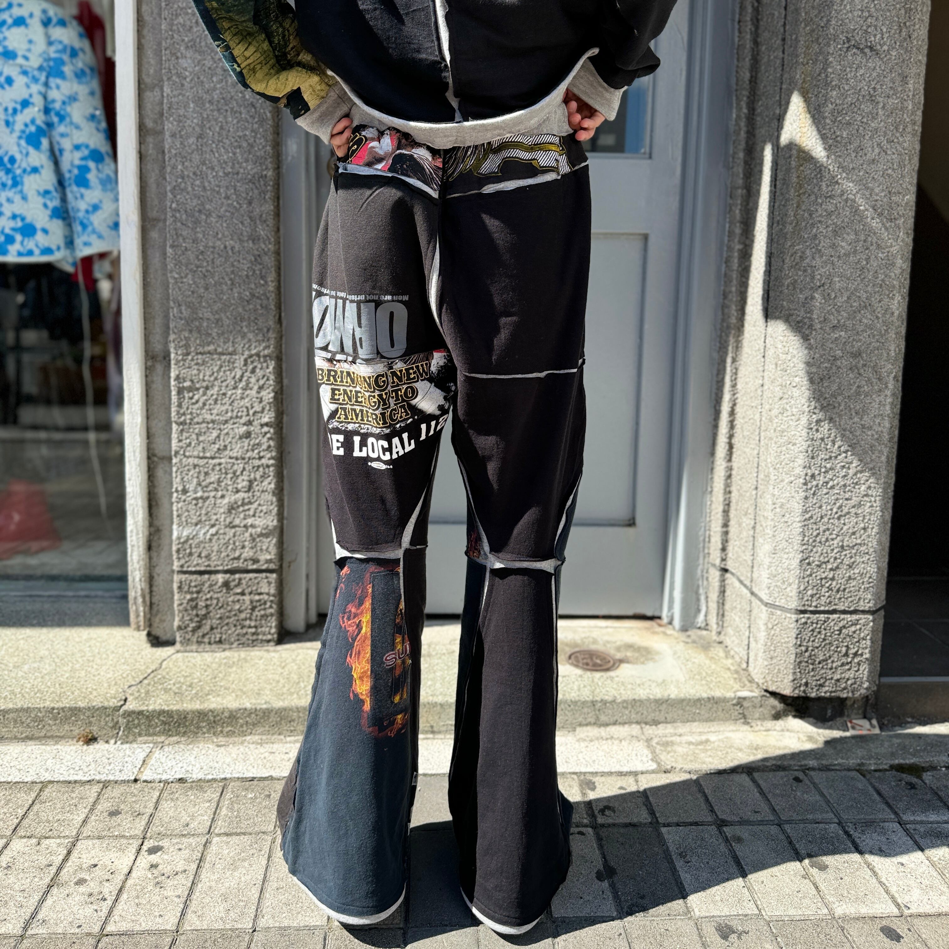 パネル上に配置された生地の断ち切り端がカールしバイオレンスと柔らかさを感じる仕様のスウェットパンツ。